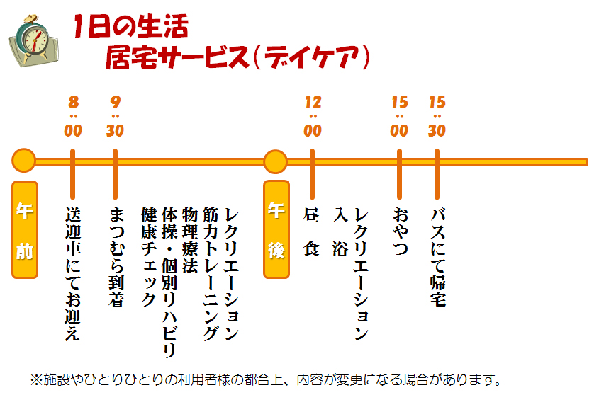 ご家庭で生活しながら当施設に通っていただき、食事、入浴、リハビリ、送迎などのサービスを受けていただきます。