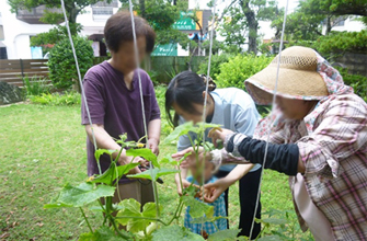 中庭で育てた野菜を収穫