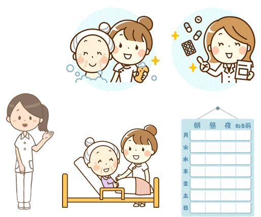 - 清拭、洗髪、入浴、食事等の日常生活のケア