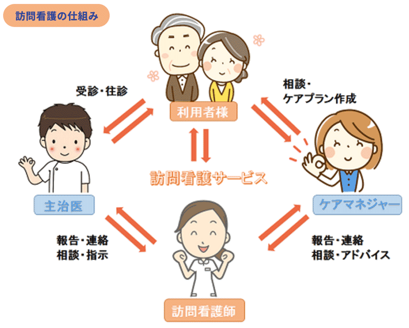 かかりつけ医師の指示に従って、連絡を取りながら看護師が定期的に訪問し、
